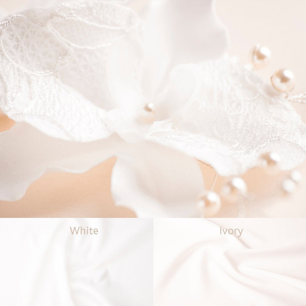 - arrangement of two handmade orchid flowers of lace and dull satin fabric;